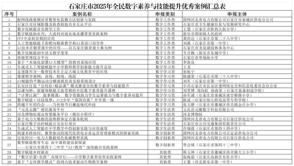 為確保評選公平公正、專業權威,活動主辦方先對申報案例進行初篩,再邀請數字化領域專家組成評審組開展專業評審,最終確定30個案例為石家莊市2025年全民數字素養與技能提升優秀案例(名單附后)。此次優秀案例的公布,將為全市各地各單位提供可借鑒的實踐經驗,推動全民數字素養與技能提升工作走深走實,為石家莊數字經濟高質量發展注入新動能。