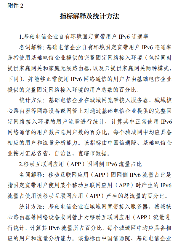 五、加強督促評測,促進工作實效落地。基礎電信企業集團公司要對開展“網絡去NAT”試點工作的子(分)公司給予必要政策傾斜和資金保障。要不斷豐富監測技術手段,構建監測體系,按月開展分省基礎電信企業自有環境固定寬帶用戶IPv6連通率、移動互聯網應用(APP)固網側IPv6流量占比、內容分發網絡(CDN)IPv6流量占比(附件2)等指標統計。工業和信息化部、中央網信辦將適時組織公布相關監測結果。各省(區、市)通信管理局、工業和信息化主管部門要強化行業管理,加強工作指導。各省級網信辦要督促互聯網企業加強協同,合力推動“網絡去NAT”目標完成。