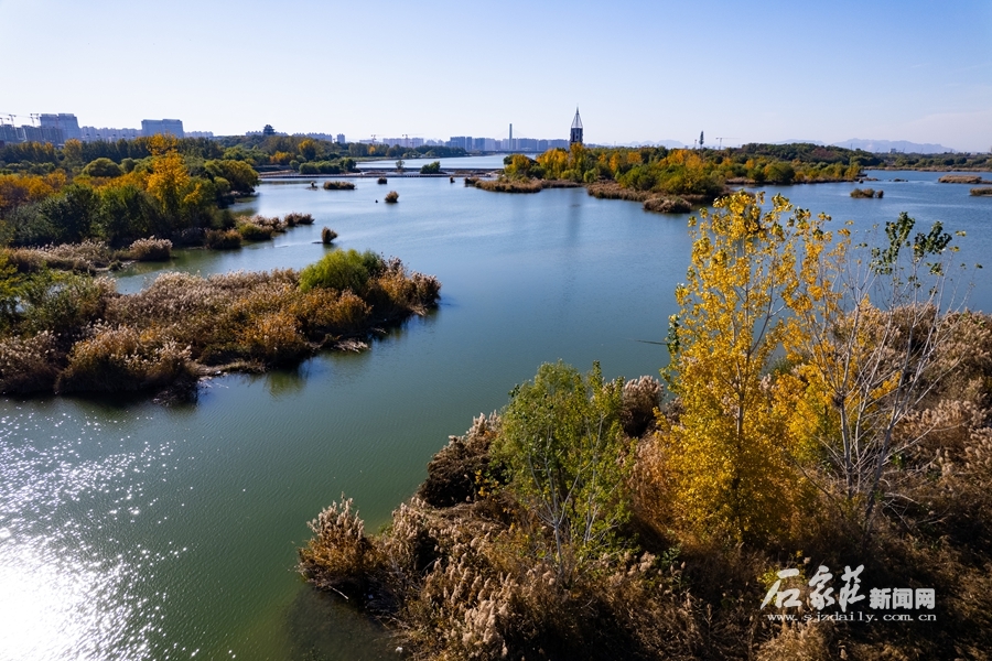 11月4日,天氣晴朗,深秋的滹沱河畔散發(fā)著迷人的色彩,記者通過無人機(jī)拍下色彩斑斕的滹沱河。