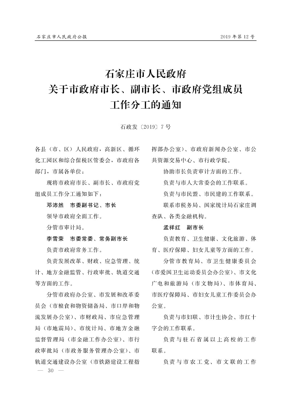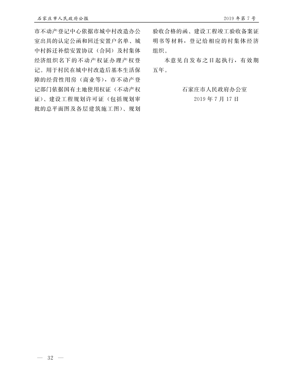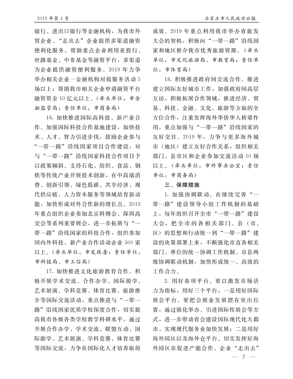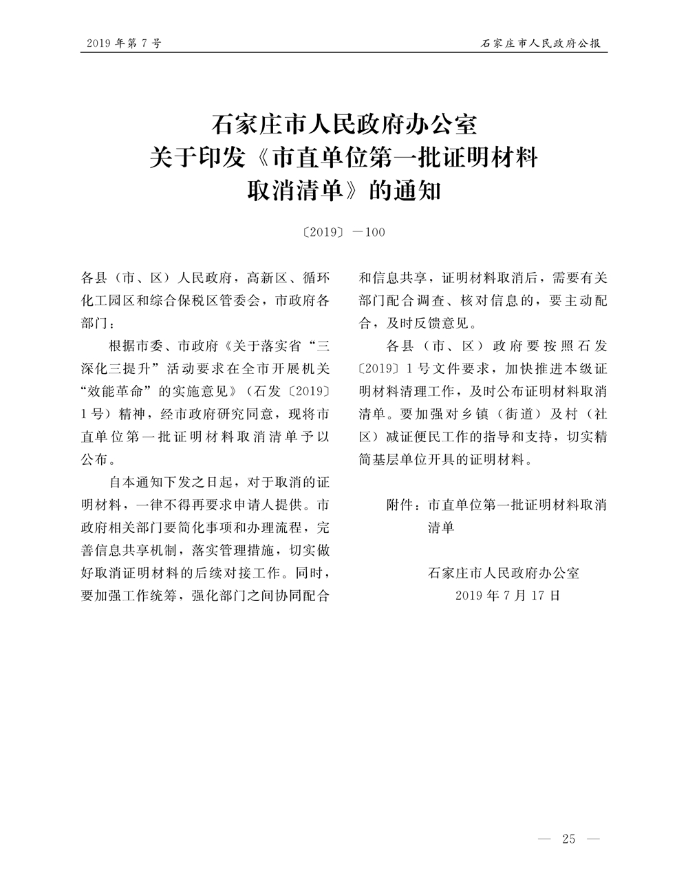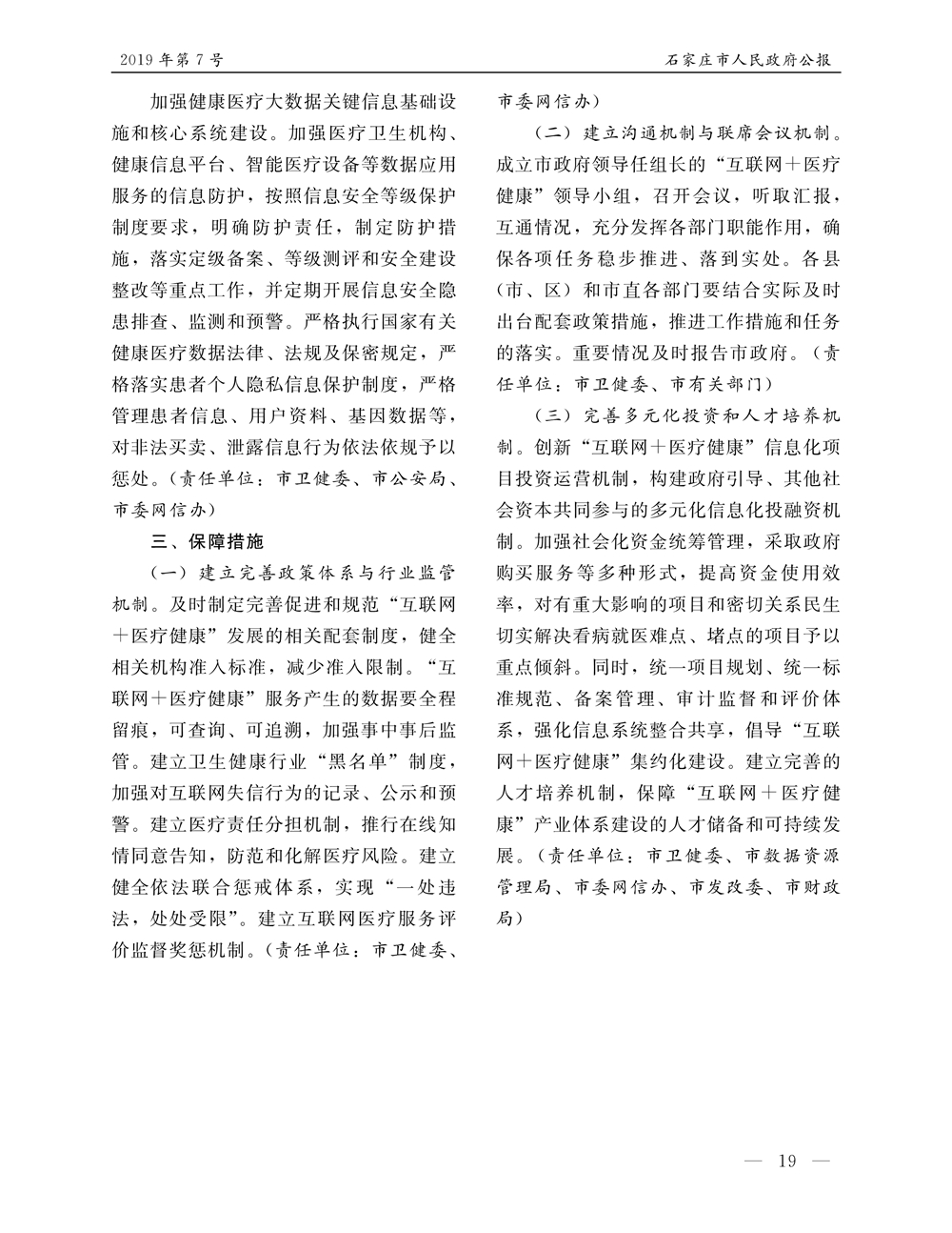 石家莊市人民政府公報2019年第7號