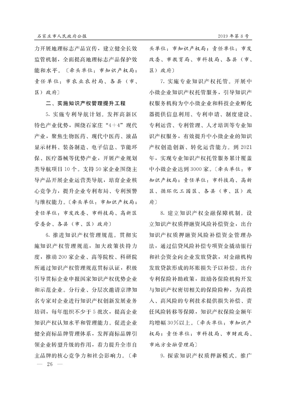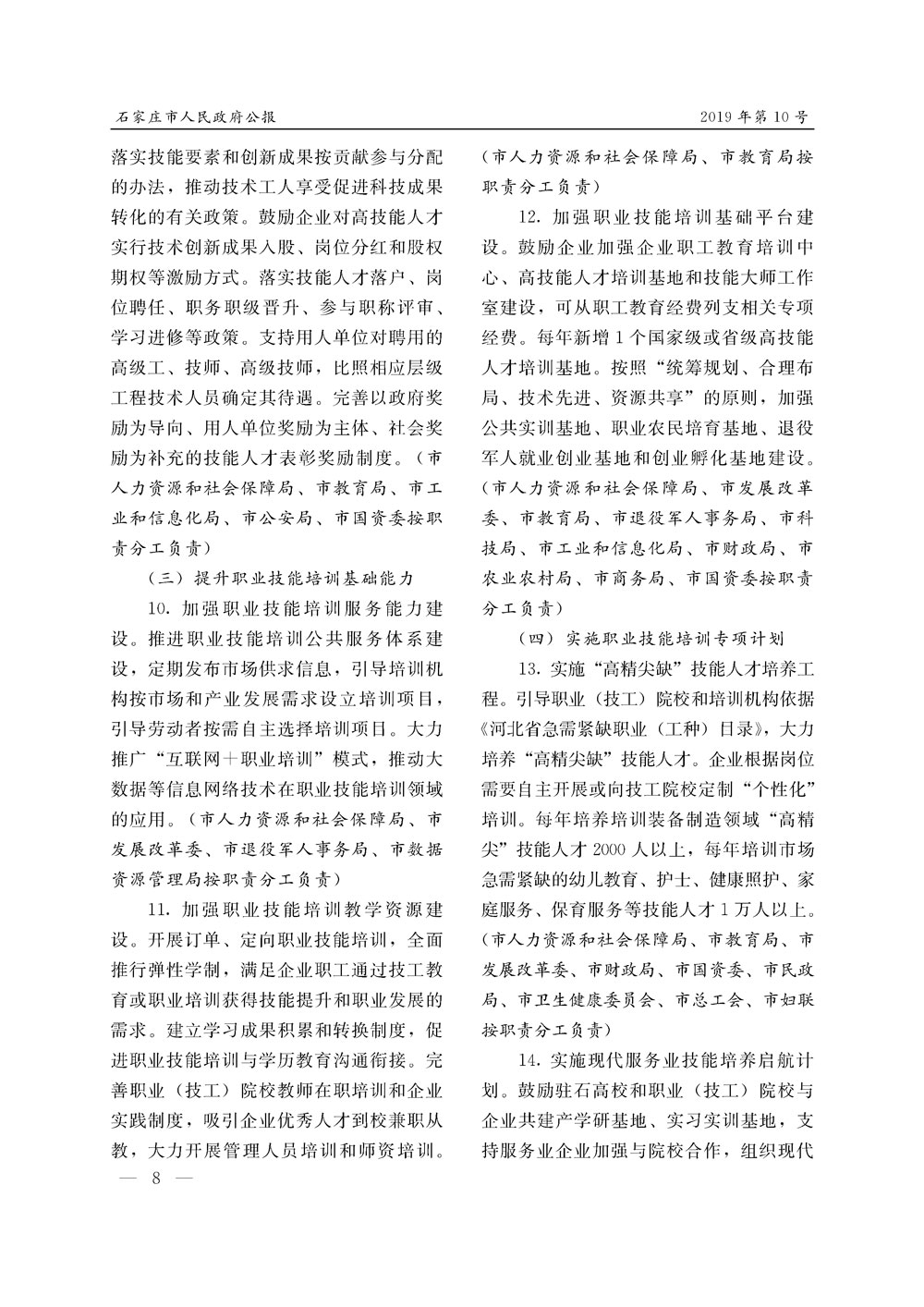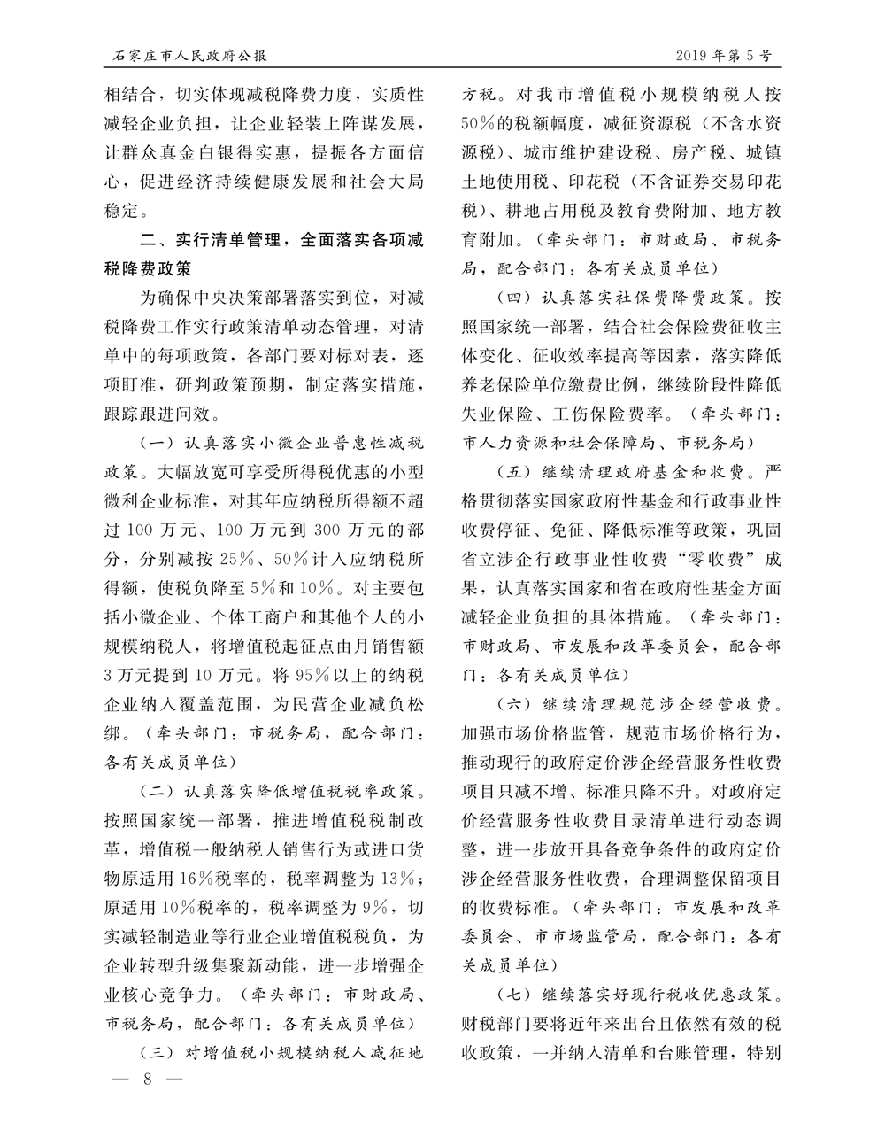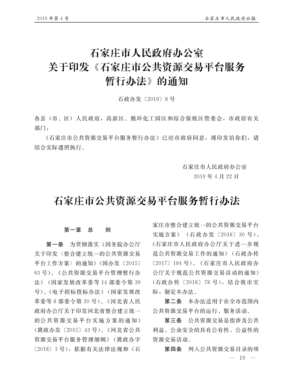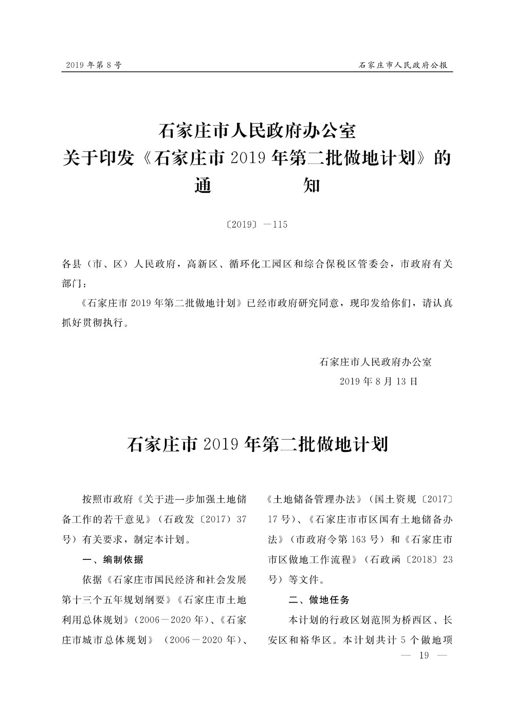 石家莊市人民政府公報2019年第8號