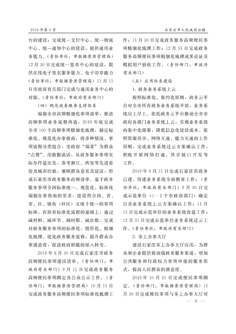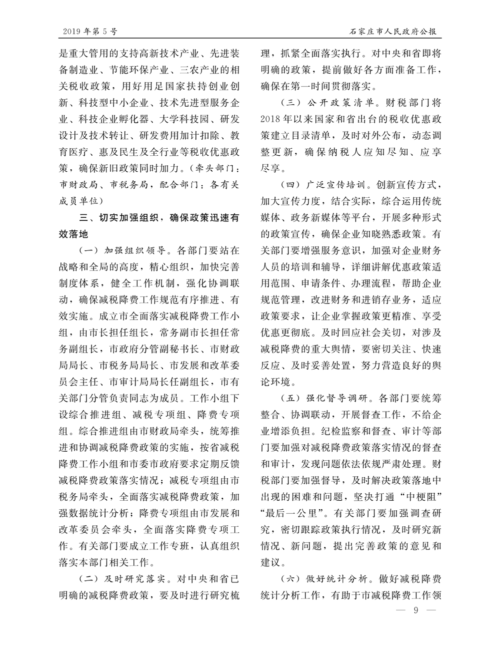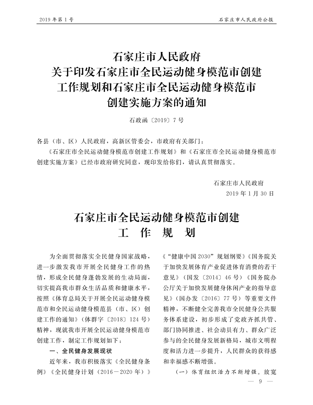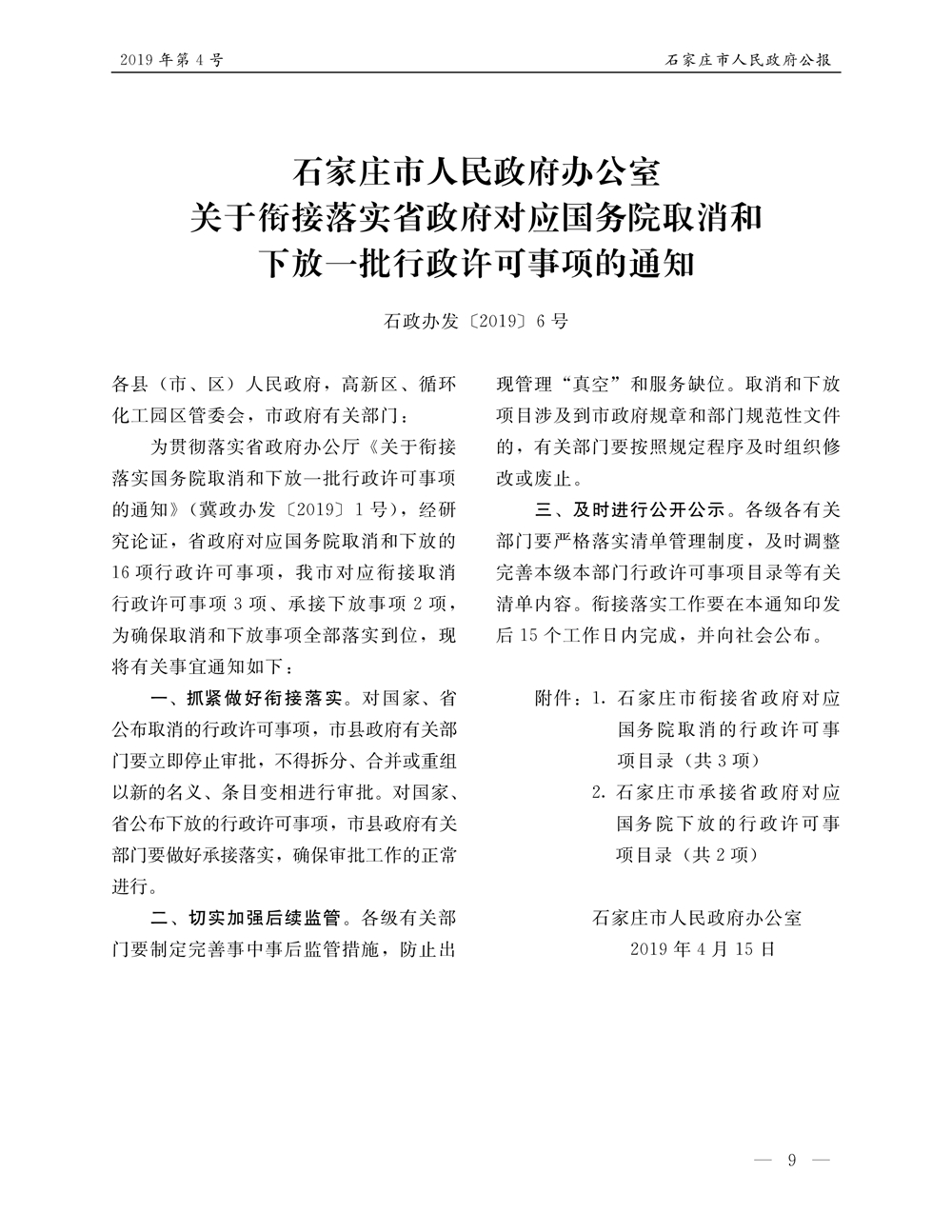 石家莊市人民政府公報2019年第9號