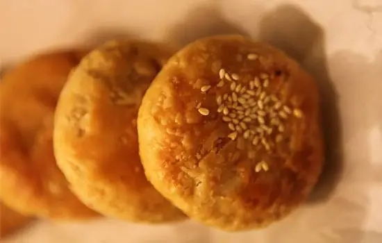 石塔燒餅的制作說起來簡單,就是將活好的面稍餳后上油案,搟成大片在抹上油酥,卷成長條狀,揪劑子團窩茬口,搟成圓餅,在光面抹清水撒上麻仁入爐烘烤即可。然而實際操作起來卻十分復雜。要經過和面、搟餅、擦瓤面、加糖、包圓、再搟餅、入吊爐、點紅、入吊爐、翻三次、上兩次油十幾道工序。過去,打這種燒餅要用吊爐,將做好的生坯放入吊爐內烘烤,適時翻面、抹油,等燒餅兩面烤至微黃色時才出爐。出爐算是最美的時刻了,爐內的燒餅金黃,爆起點點油花,屋內的香氣四溢,面點師的用木鏟飛快地將一個個圓圓的燒餅鏟到木箱里,排列的整整齊齊,于是,循著香氣奔來的食客就掏出了錢包,掌柜一邊與食客寒暄,一邊麻利地用草紙將燒餅卷成卷、遞去,小小燒餅為人們帶來過多少滿足……