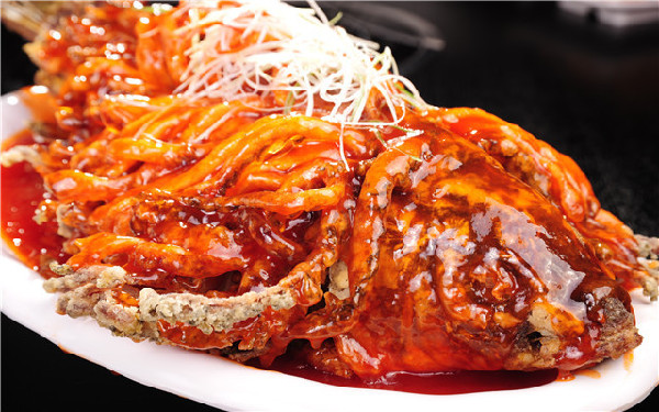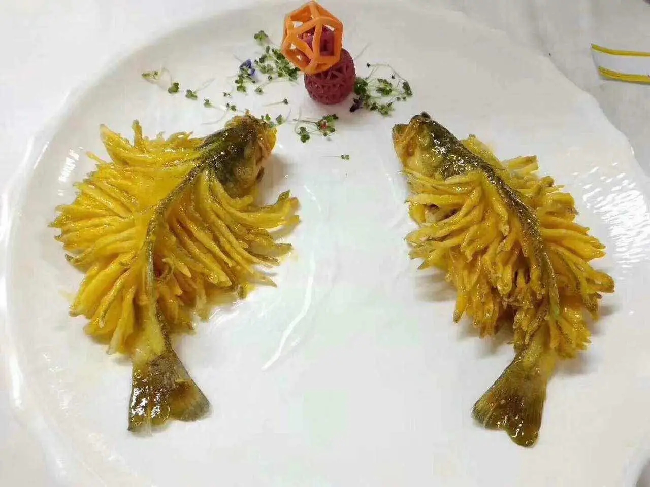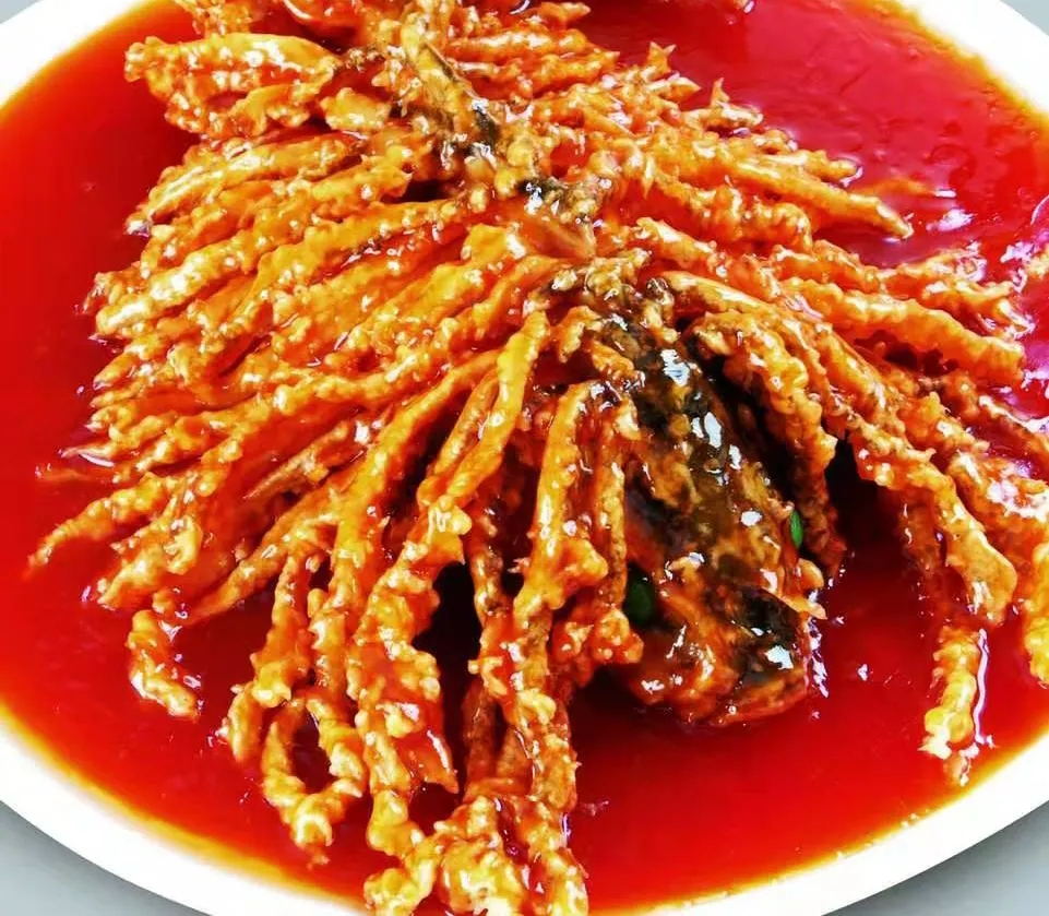 金毛獅子魚是一道河北石家莊的傳統(tǒng)名菜,屬于冀菜系。金毛獅子魚以鯉魚 為主要材料。用鯉魚加工修飾后,炸制而成。色澤金黃,魚絲蓬松形似獅子,酸甜適口。始于民國初期,最早由石家莊市的中華飯莊名廚袁清芳創(chuàng)制。因成菜色澤金黃,形似獅子,故名。1952年在河北八大城市烹調技術表演賽中,袁烹制的“金毛獅子魚”,獲得了高度評價。該菜是河北參加1983年全國烹飪鑒定會的名菜。