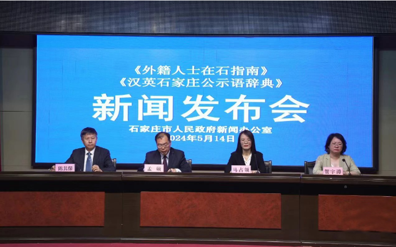 5月14日,石家莊市政府新聞辦召開《外籍人士在石指南》(以下簡稱《指南》)《漢英石家莊公示語辭典》(以下簡稱《辭典》)新聞發(fā)布會。石家莊市政府外事辦黨組副書記、副主任孟碩,石家莊市政府外事辦四級調(diào)研員馬占領(lǐng),石家莊市翻譯協(xié)會會長、石家莊學(xué)院外國語學(xué)院副院長賀宇濤分別介紹《指南》《辭典》有關(guān)情況,并答記者問。
