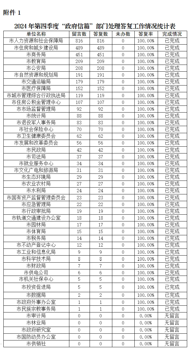 附件1:2024年第四季度“政府信箱”部門處理答復工作情況統計表