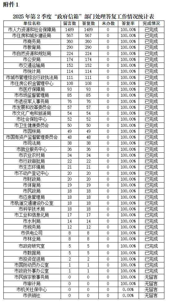附件1:2025年第2季度“政府信箱”部門處理答復工作情況統(tǒng)計表
