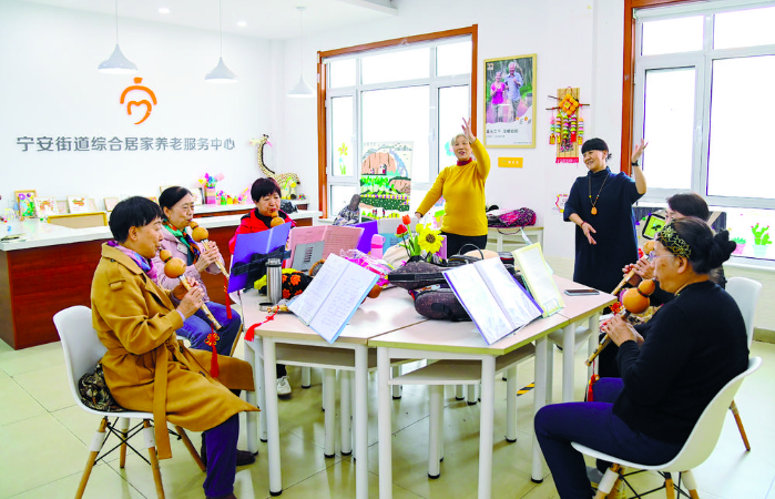 11月4日下午,位于新華區寧安街道黨群服務中心的綜合居家養老服務中心里絲竹悠揚—— 一樓大廳內兩位阿姨伴隨著幾位伙伴吹奏葫蘆絲的婉轉樂曲翩翩起舞,二樓民樂團吹拉彈唱樂曲激昂……這座看似普通的小樓正成為附近老人的精神文化家園。葫蘆絲中級班班長敦淑利介紹:“我們有200多人的葫蘆絲隊伍。來這里豐富了我們老年人的生活,對身心都有益。”寧安街道區域養老服務中心主任吉曉娜介紹,目前這里的老人們組建了京劇隊、豫劇隊、合唱團、藝術團等多個藝術團體。民樂團團長王淑珍帶領著40多人的隊伍,彈撥樂、弦樂、吹打樂、打擊樂一應俱全。“就是我們這里場地太搶手,我們民樂團每周只能活動一次。”王淑珍說,“每次排練結束,大家都意猶未盡。”