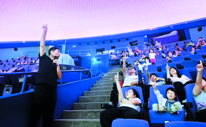 在宇宙劇場,現場觀眾沉浸式進行星空觀測。(省科技館供圖) “看!這就是仙后座,大家可以觀察一下它的特征。”9月7日晚,河北省科技館的宇宙劇場內,球形屏幕緩緩亮起,館內科技輔導員劉亞玲為前來參觀的觀眾講解著秋季星空的知識。觀眾席中傳來輕聲驚嘆,孩子們抻長脖子,仿佛想要觸摸到那些閃爍的星星。 從17點到22點,科技館內燈火通明,人影穿梭。除了宇宙...