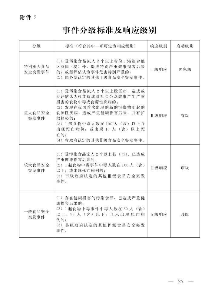 按照緊急程度、影響范圍和嚴(yán)重程度,食品安全突發(fā)事件分為特別重大食品安全突發(fā)事件(Ⅰ級(jí))、重大食品安全突發(fā)事件(Ⅱ級(jí))、較大食品安全突發(fā)事件(Ⅲ級(jí))和一般食品安全突發(fā)事件(Ⅳ級(jí))四級(jí)(分級(jí)標(biāo)準(zhǔn)見附件2)。