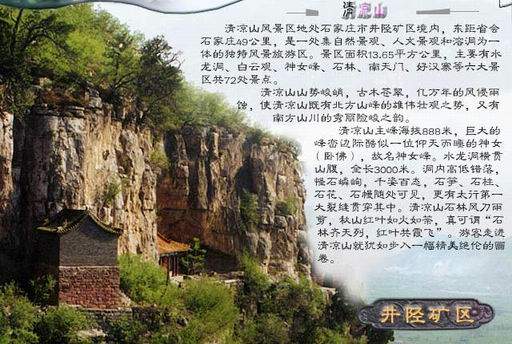 Qingliang Mountain lies within Jingxing mining area, 48 kilometers east from Shijiazhuang. There is one No.203 bus every five minutes at the East Stop, and the family hotels are built specially for the star scenic spot, which can receive the touring party of about 100 people. The Qingliang Mountain is the unique scenic spot that incorporates natural landscape, cultural sites and limestone caves with stalactites and stalagmites, so that it is one of the best places for summer resort, recreation, spending holidays and exploration. Qingliang Mountain covers an area of 13.65 square kilometers and is mainly made up of six major scenic spots such as a ShuiLong Hole, Baiyun Monastery, Goddess' Peak, Stone Forest, etc., which amount to 72 sight spots.