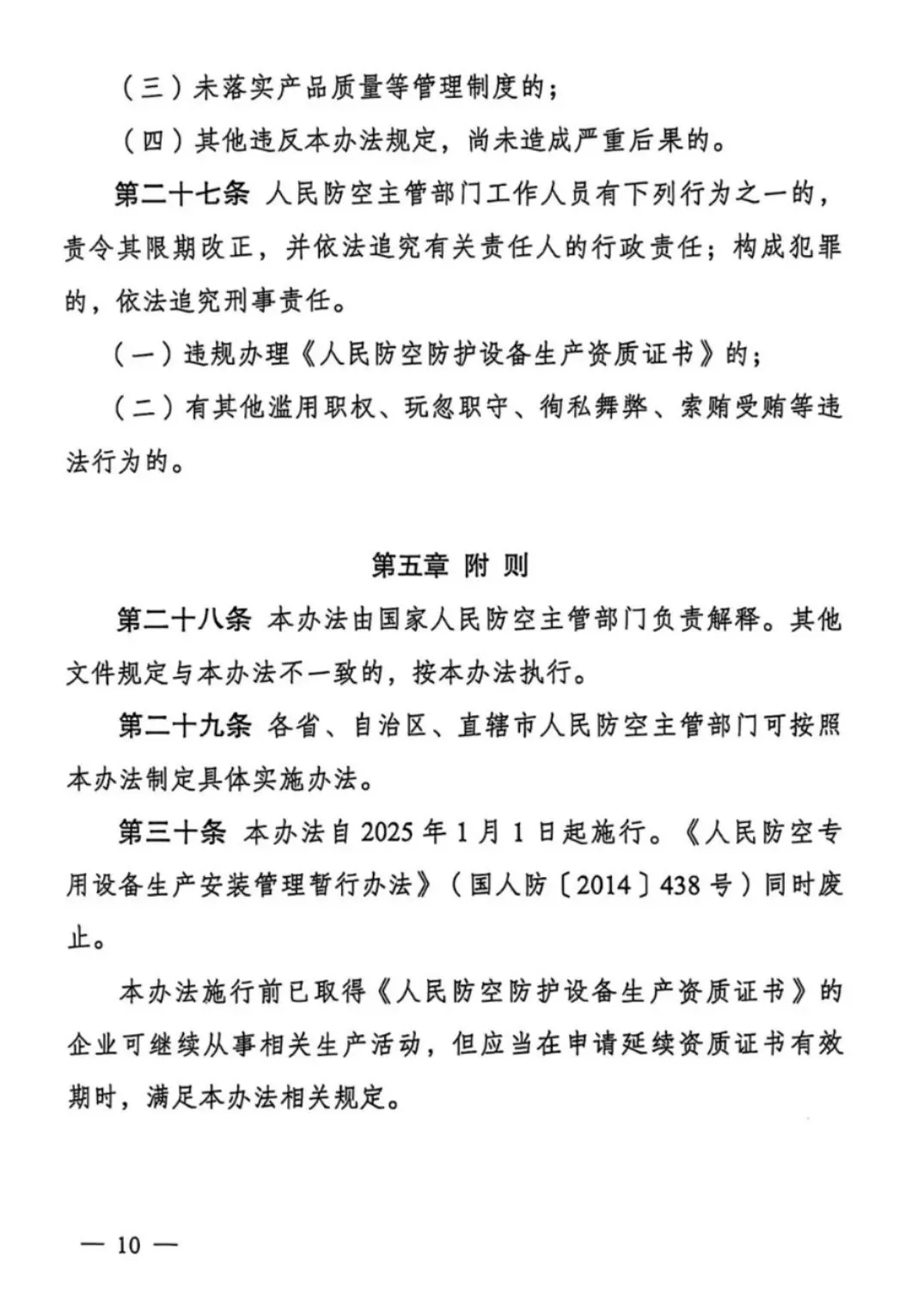 近日,國家發展和改革委員會公布第 24 號令《人民防空防護設備管理辦法》,共五章三十條,自 2025 年 1 月 1 日起施行。原文如下↓