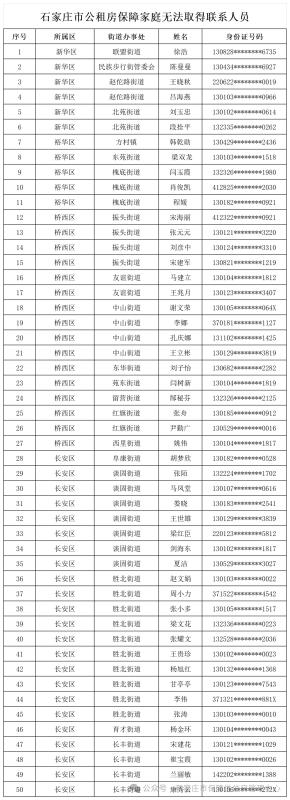 在日常監(jiān)管核查中,部分申請(qǐng)人因電話號(hào)碼更換、停機(jī)、關(guān)機(jī)、拒接等原因,導(dǎo)致管理部門無法與其取得聯(lián)系。現(xiàn)將在聯(lián)審聯(lián)查家庭信息核查處理、辦理安居保障卡等工作中無法取得聯(lián)系人員名單(見附件)進(jìn)行公示,公示期10天。公示期滿后仍未與申請(qǐng)地街道辦事處取得聯(lián)系的,區(qū)住房保障部門可取消其公租房保障資格。