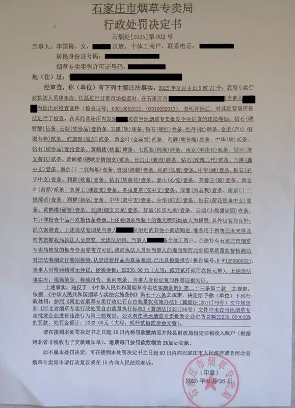 石家莊市煙草專賣局行政處罰決定書(石煙處【2025】第003號)