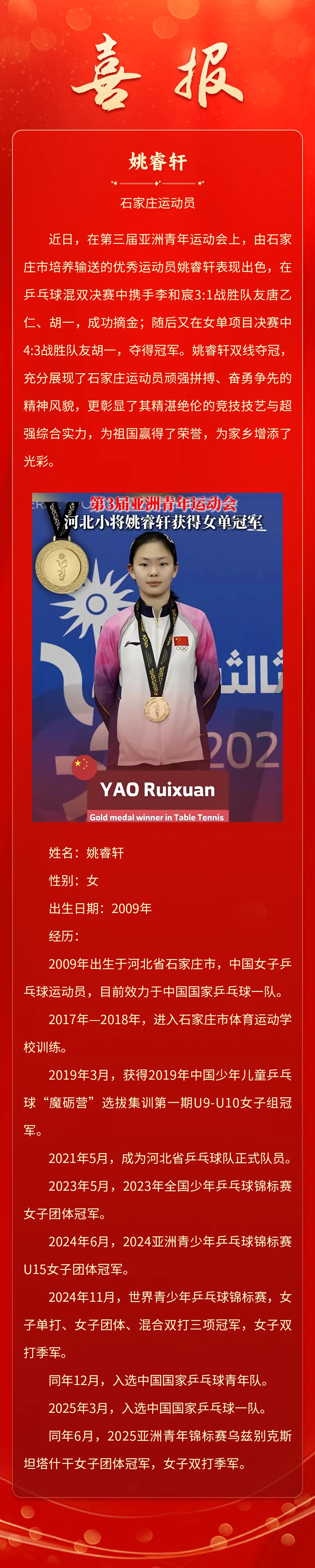 喜報 | 閃耀亞青會!石家莊小將姚睿軒包攬乒乓球女單、混雙冠軍,加冕“雙冠王”!